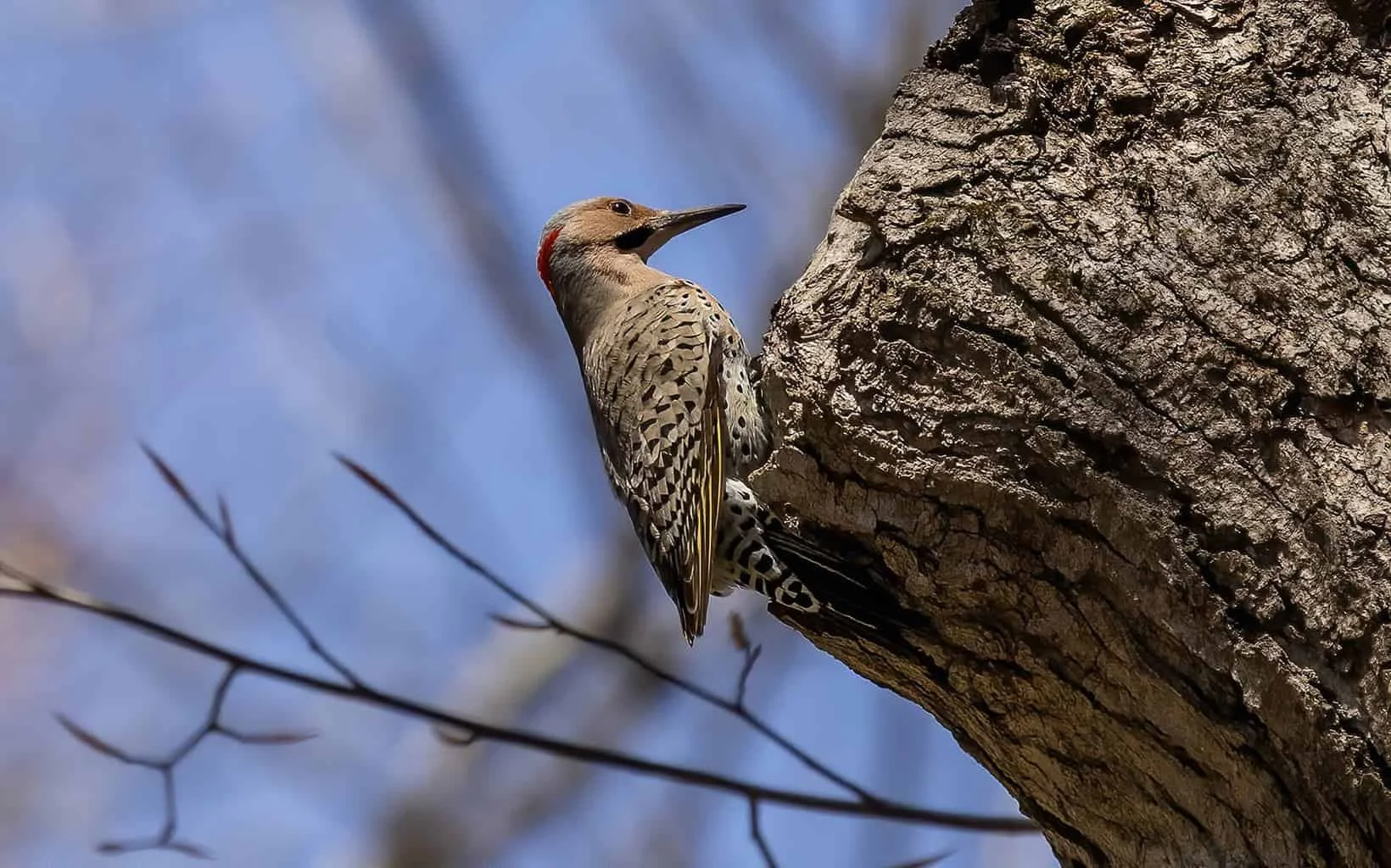 Woodpeckers peck at wood. They do it to uncover insects that hide under the bark. They do it to carve out small hollows in tree trunks to use as homes. And sometimes they do it as a way of talking to each other. In the early spring they can be heard hard at work making nest sites in the sides of tall trees.